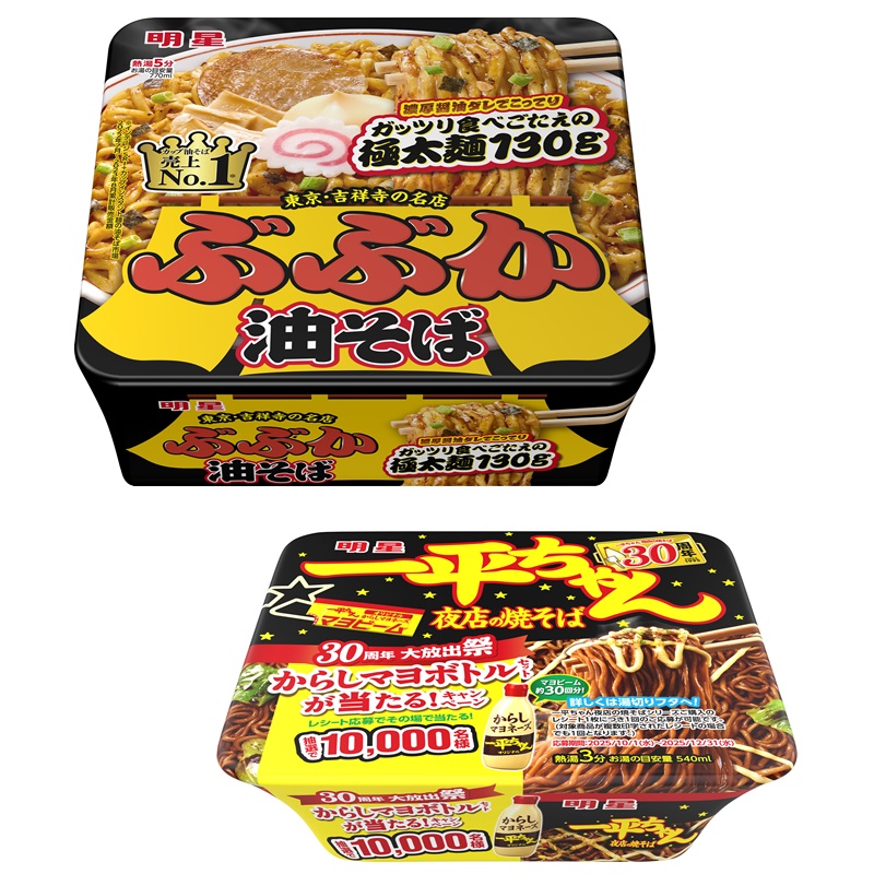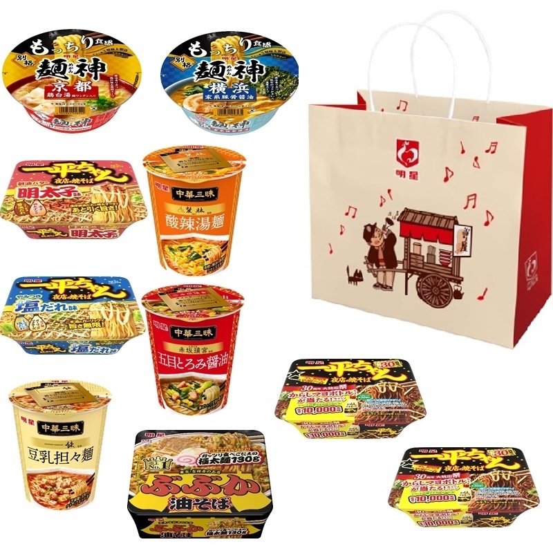 明星食品の人気ラーメン、焼きそばの詰め合わせが入ったお楽しみ袋です。