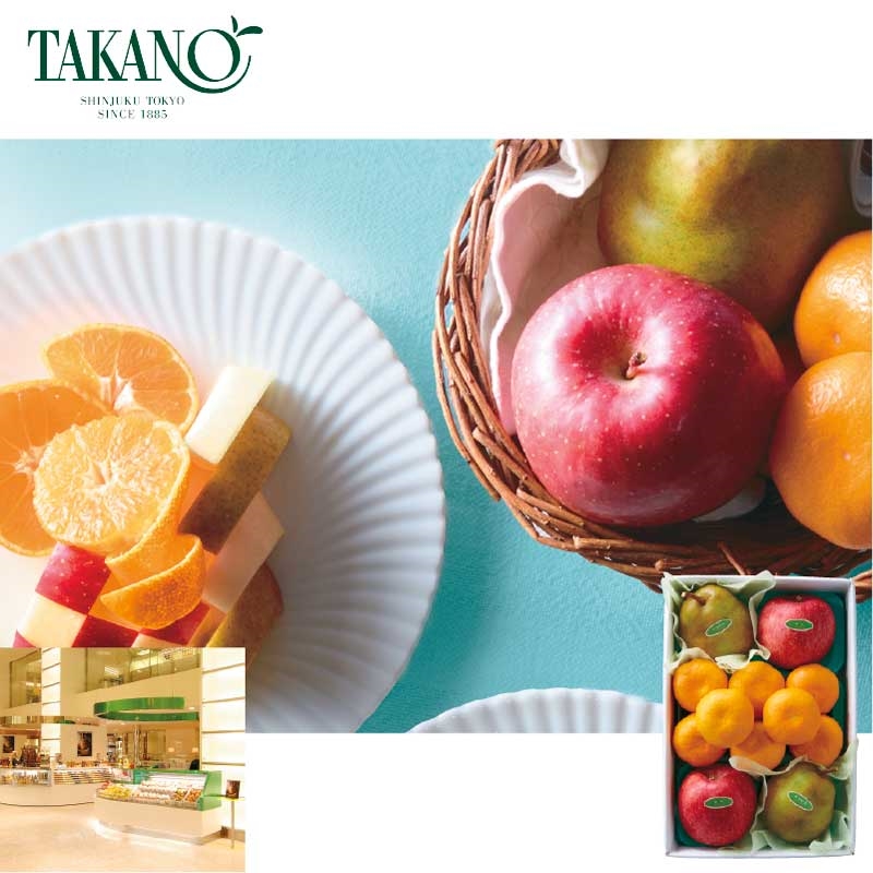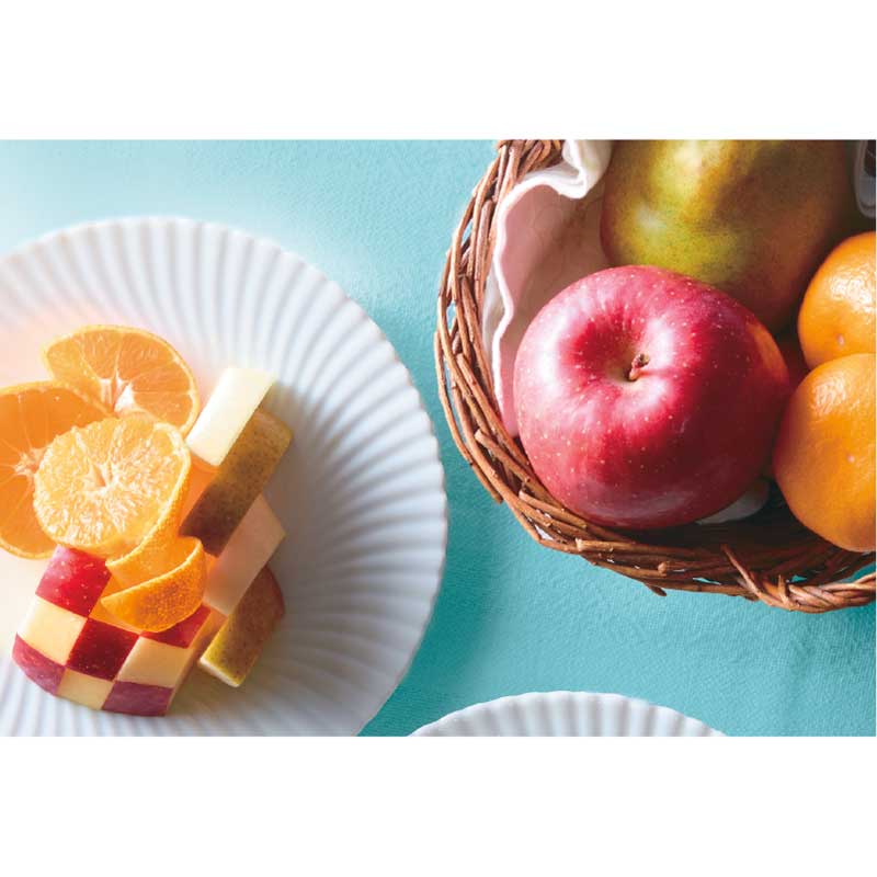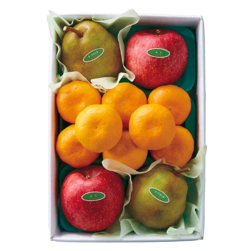 - ラ・フランス(山形県)x2、 ふじ(青森県、山形県または長野県産)x2 みかん(愛媛県、和歌山県または熊本県産) x8