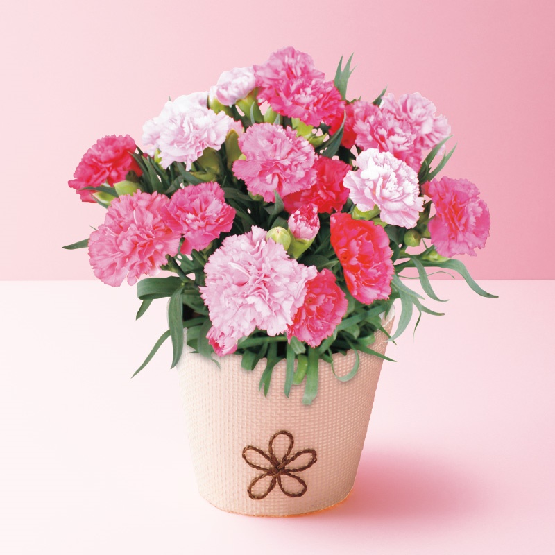 カーネーション4号鉢、バスケット、お手入れのしおり、商品サイズ:高さ 約25cm × 鉢直径 約12cm