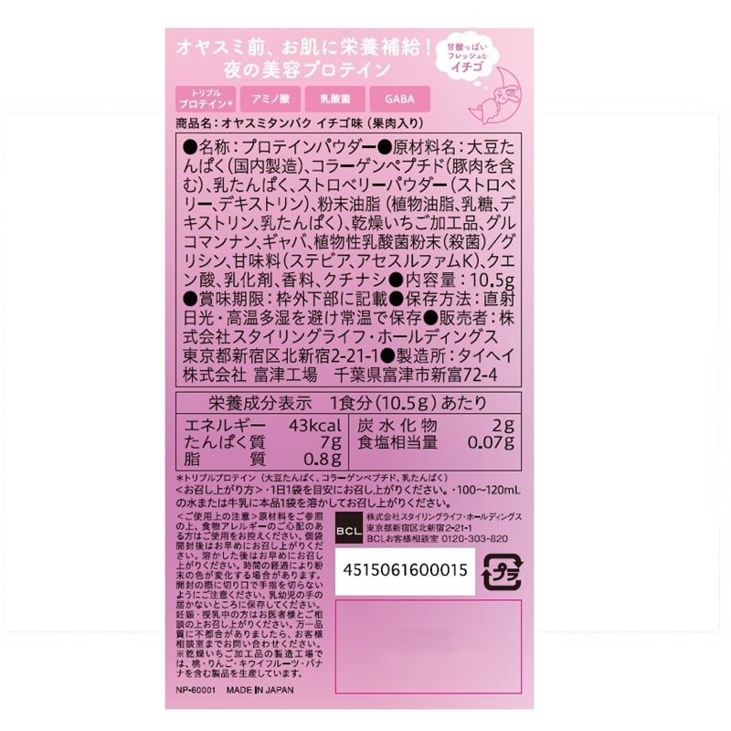 成長ホルモンの元となるアミノ酸をはじめとした栄養成分をバランス良く配合した夜の美容プロテインです。