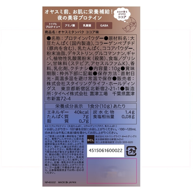 成長ホルモンの元となるアミノ酸をはじめとした栄養成分をバランス良く配合した夜の美容プロテインです。