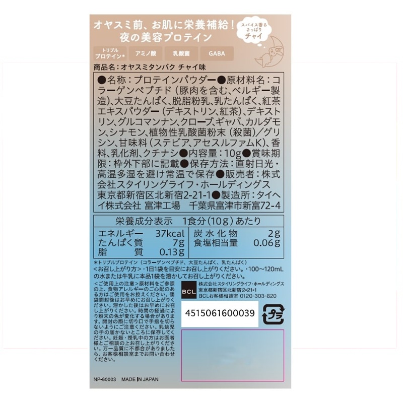 成長ホルモンの元となるアミノ酸をはじめとした栄養成分をバランス良く配合した夜の美容プロテインです。