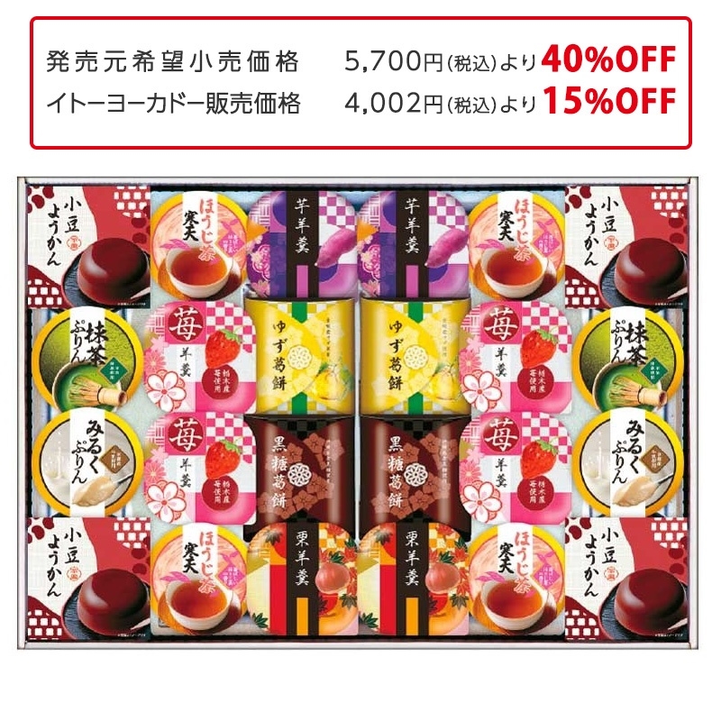 小豆ようかん70g×4、ぷりん(抹茶・みるく)各45g×各2、ほうじ茶寒天45g×4、他5種12点