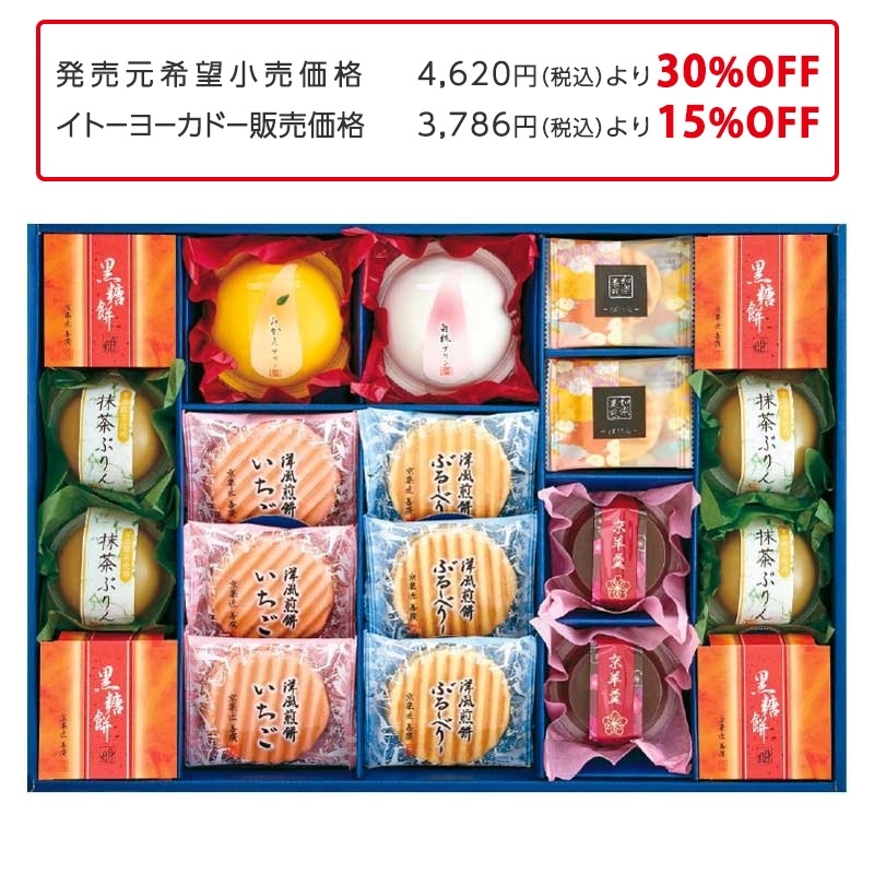 京羊羹75g×2、和楽菓煎ばにら×6、プリン(みかん・白桃)各135g、黒糖餅・抹茶ぷりん各64g×4、他2種6点