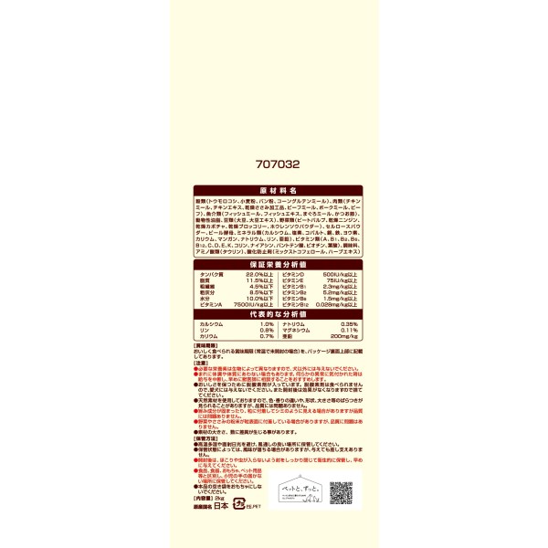 魚介類(フィッシュミール、フィッシュエキス、まぐろミール、かつお節)、動物性油脂、豆類(大豆、大豆エキス)