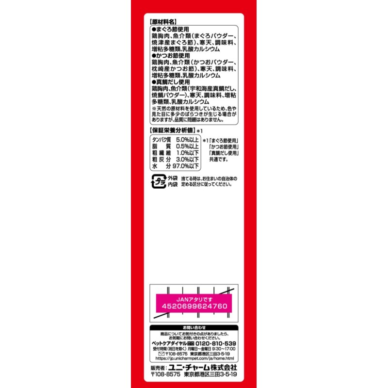 - まぐろ節使用:鶏胸肉、魚介類(まぐろパウダー、焼津産まぐろ節)、寒天、調味料、増粘多糖類、乳酸カルシウム