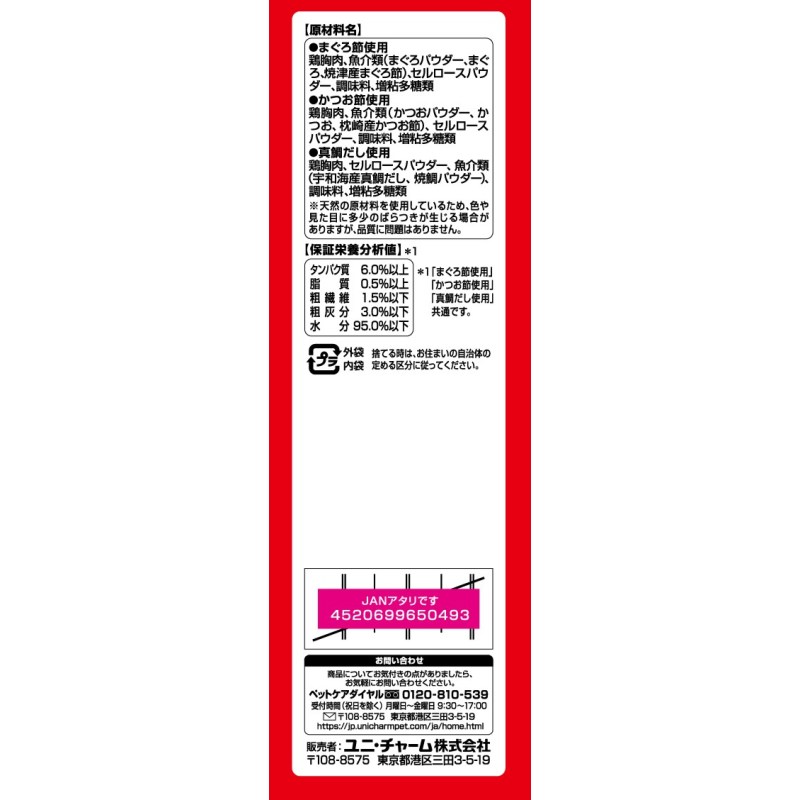 - ・まぐろ節使用:鶏胸肉、魚介類(まぐろパウダー、まぐろ、焼津産まぐろ節)、セルロースパウダー、調味料、増粘多糖類