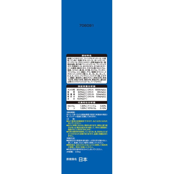 - 穀類(トウモロコシ、コーングルテンミール、小麦粉、パン粉)肉類(チキンミール、ポークミール、ビーフミール、チキンエキス)
