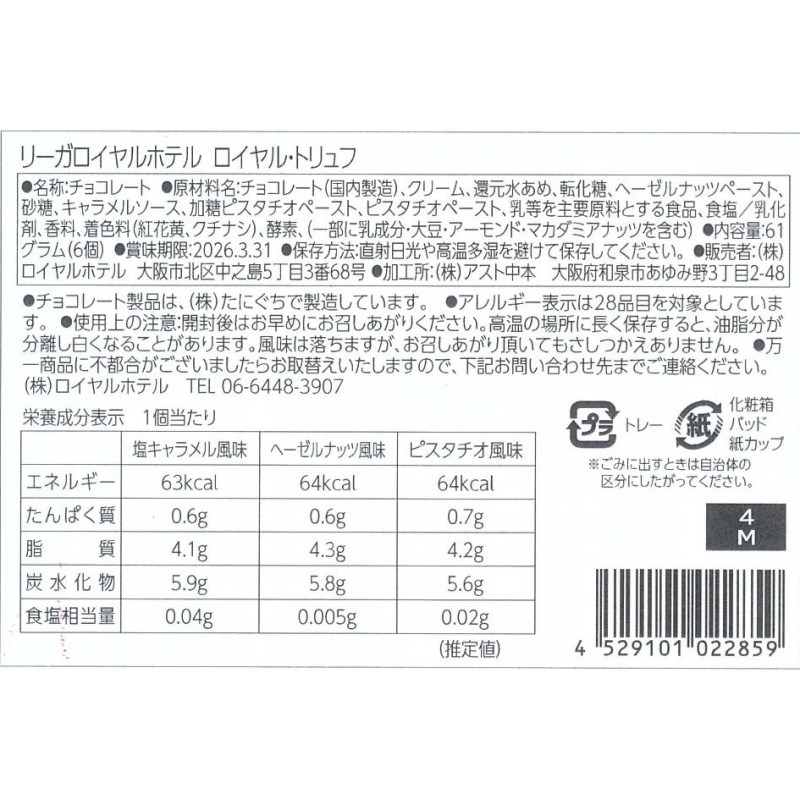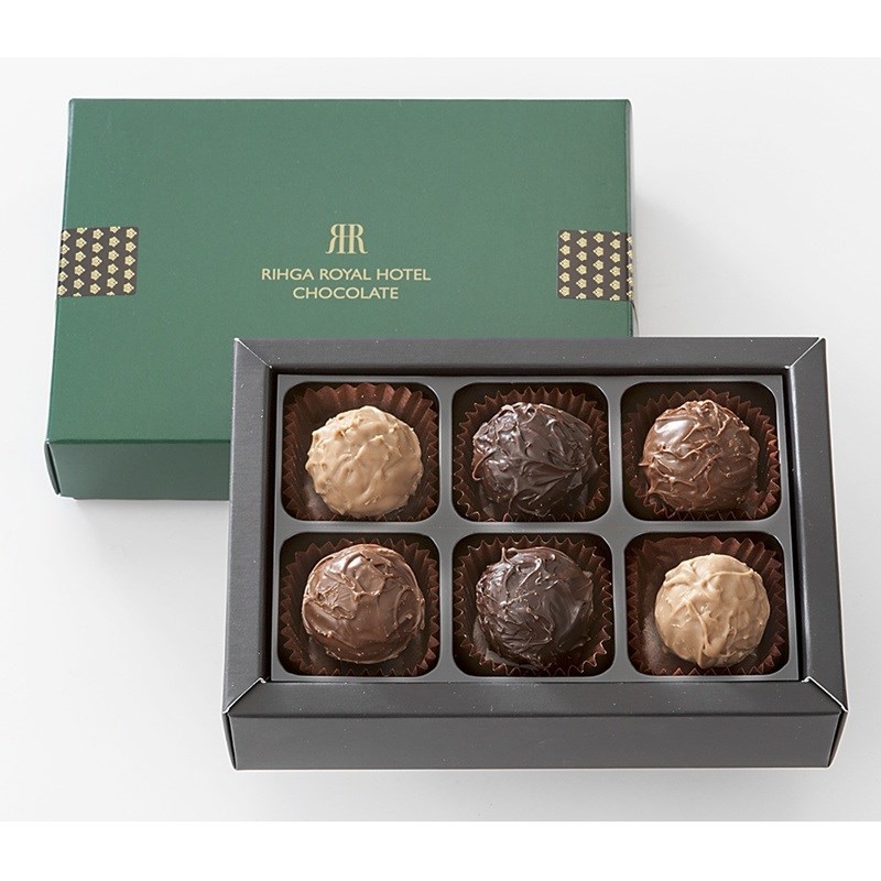 ピスタチオ・ヘーゼルナッツ・塩キャラメル味が楽しめるトリュフ6個の詰合せ。