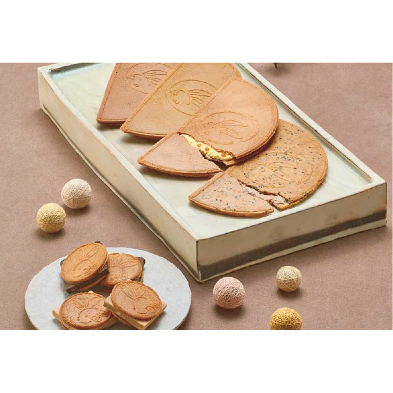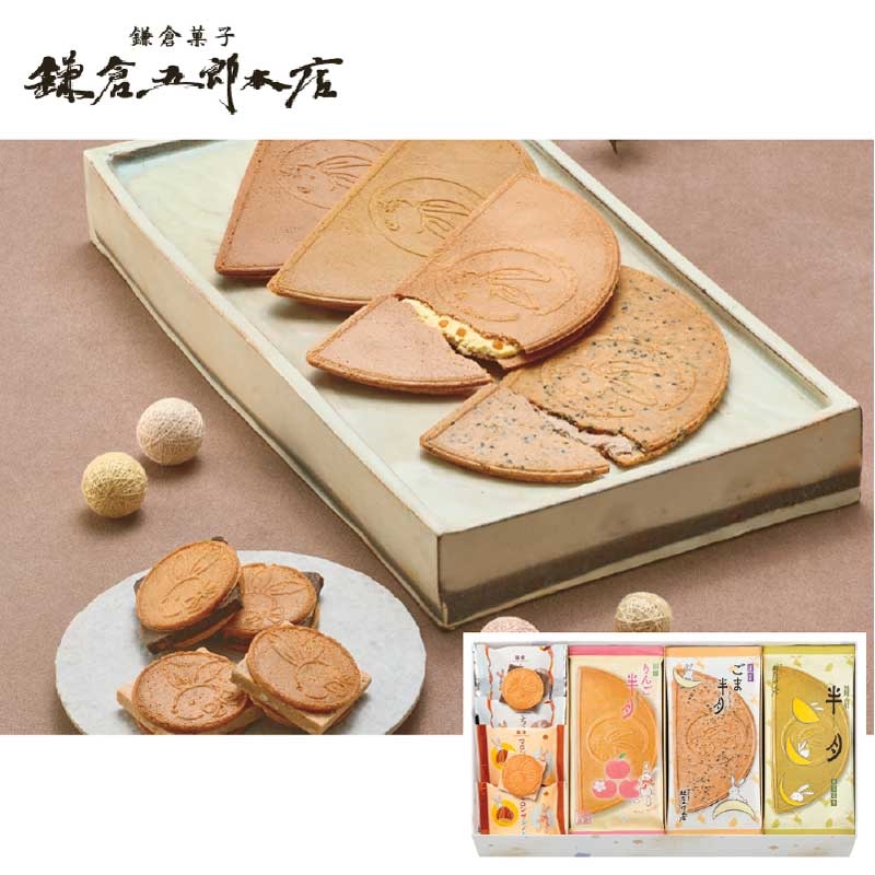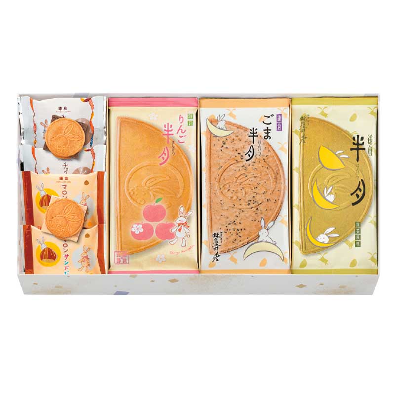 鎌倉半月(抹茶風味2枚・小倉風味3枚、ごま半月・りんご半月各5枚)、鎌倉チョコサンドだょ・鎌倉マロンサンドだょ各3個