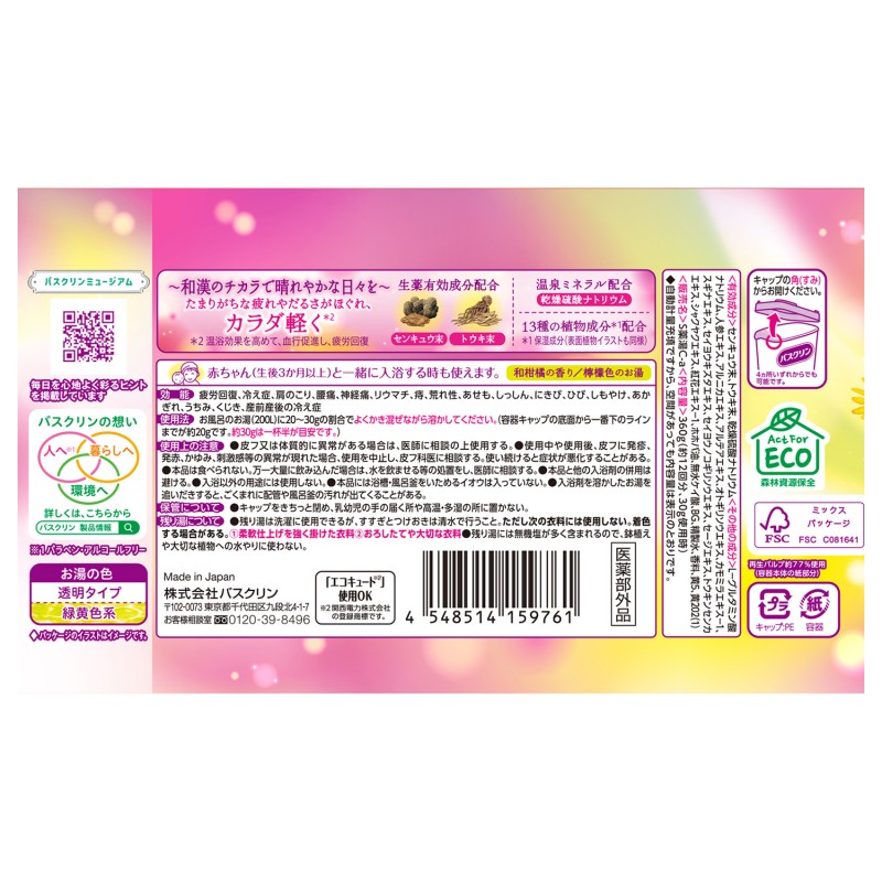 ●生薬有効成分(センキュウ末、トウキ末)と温泉ミネラル(乾燥硫酸ナトリウム)配合。温浴効果を高めて、血行促進、気になる症