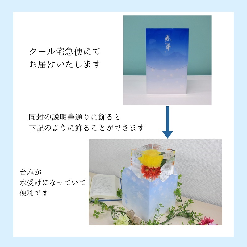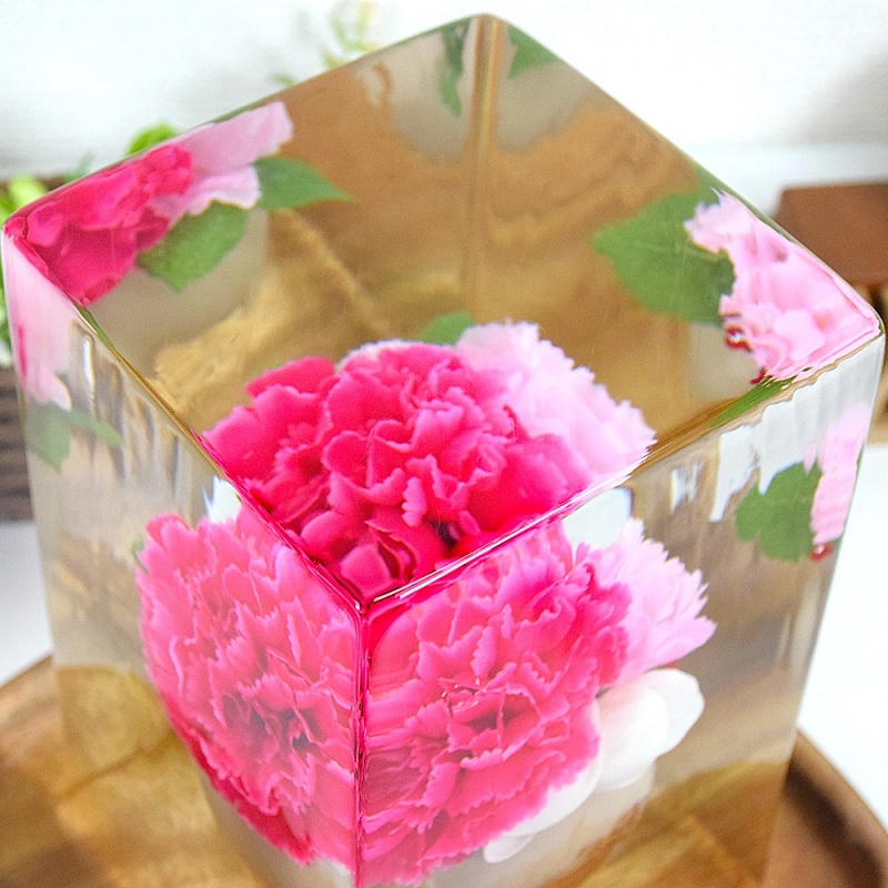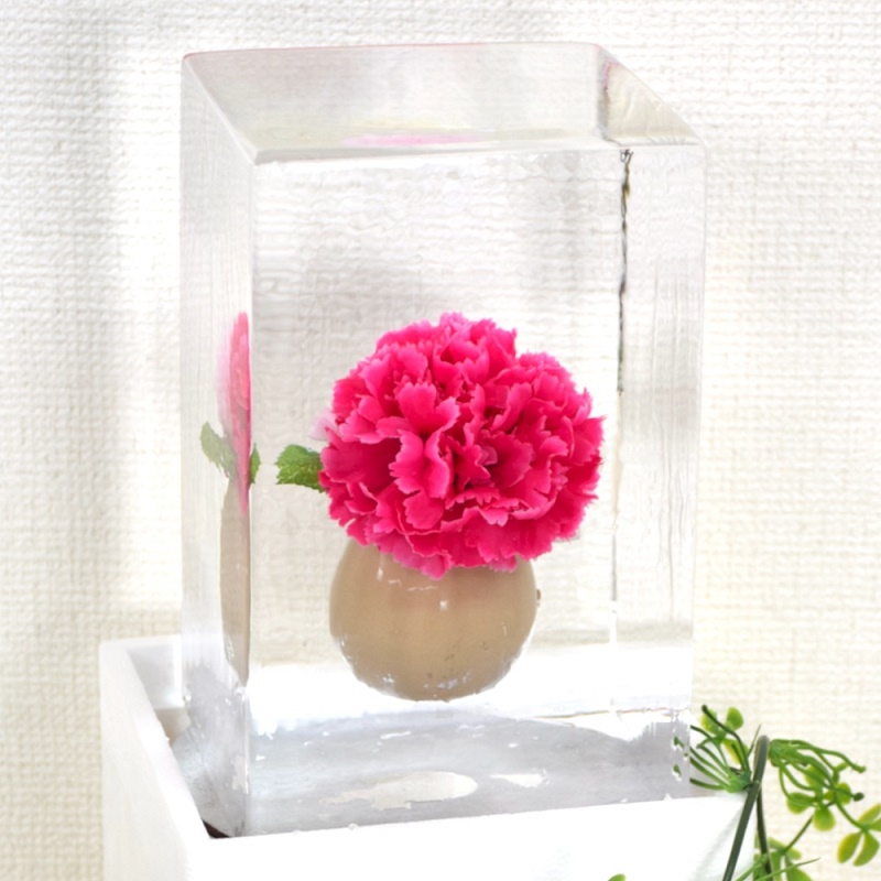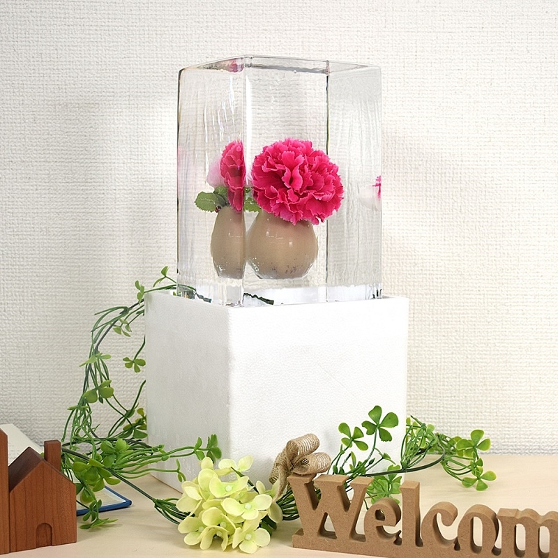 カーネーションの造花を氷の中に閉じ込めた美しいフラワーアレンジメント入り氷です。