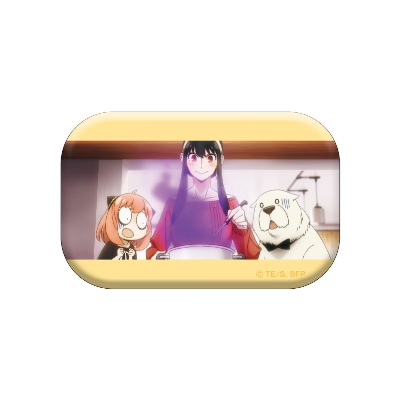 ティザービジュアルのコミカルVer.のイラストを使用したアーニャ&ヨル&ボンドのスクエア缶バッチです。