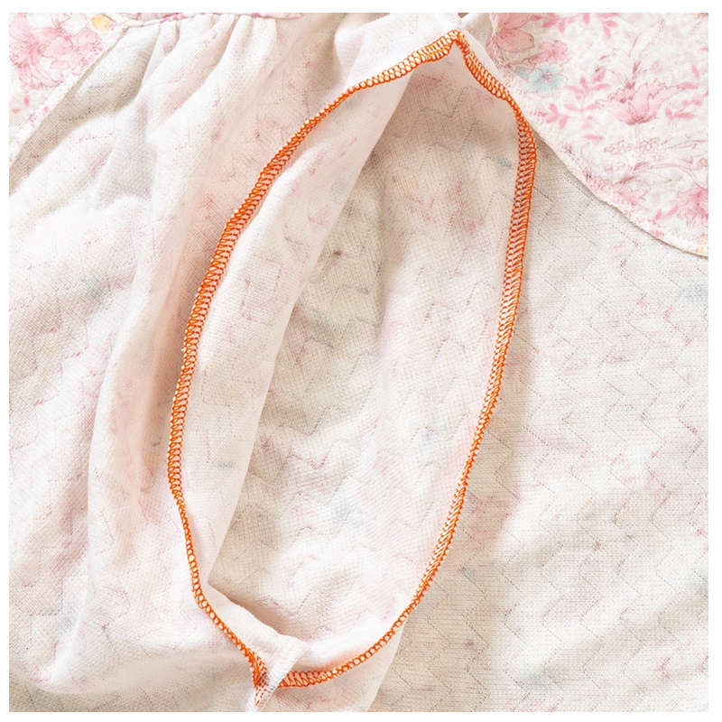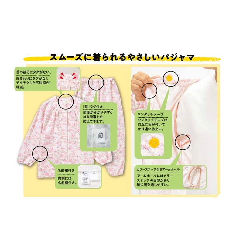袖ぐり内側にカラーステッチの目印付き、名前が書けるタグ付き。