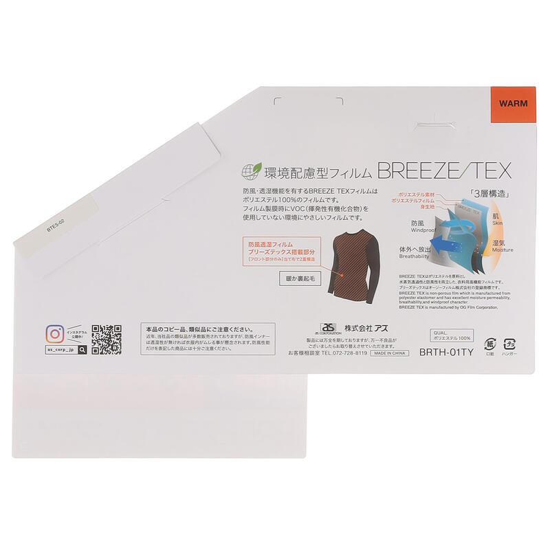 寒さを感じやすい前身頃部分に、防風透湿フィルム【BREEZE TEX】を搭載。