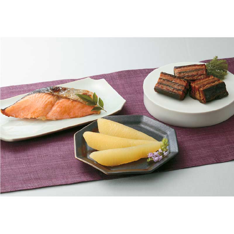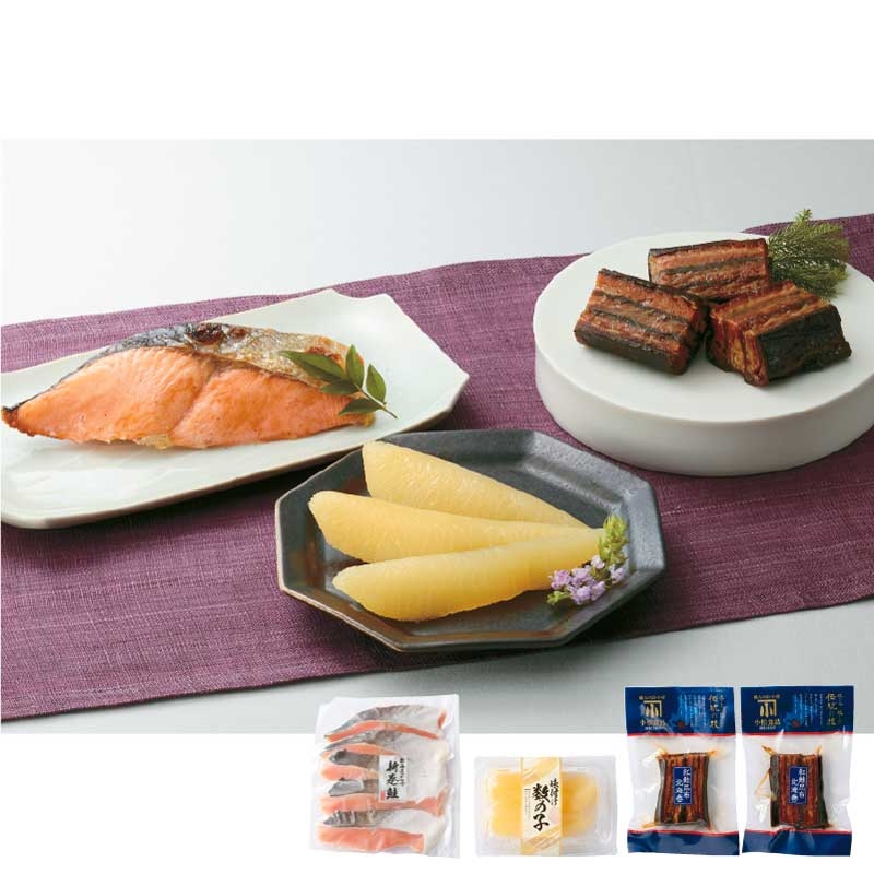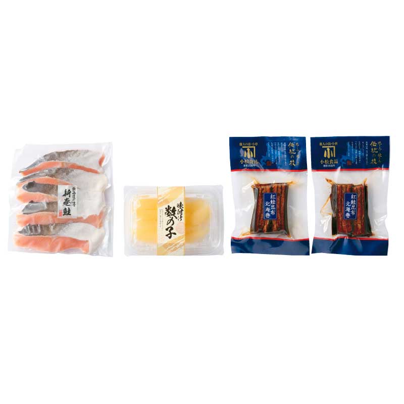 新巻鮭切身70g×5(北海道産)、味付け数の子100g(ロシア又はアメリカ産)、紅鮭昆布北海巻×2