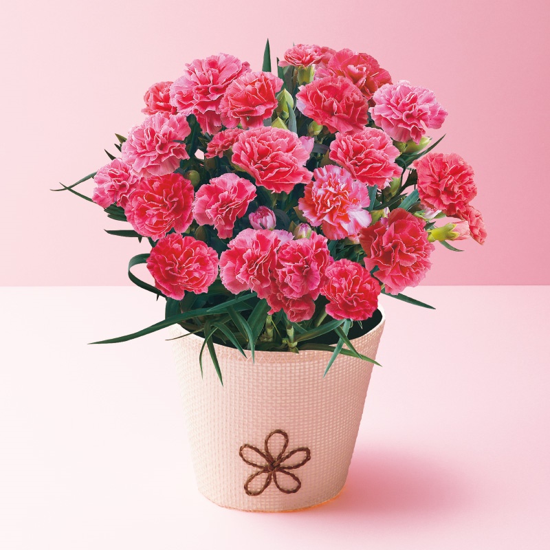 カーネーション4号鉢、バスケット、ラッピング、お手入れのしおり