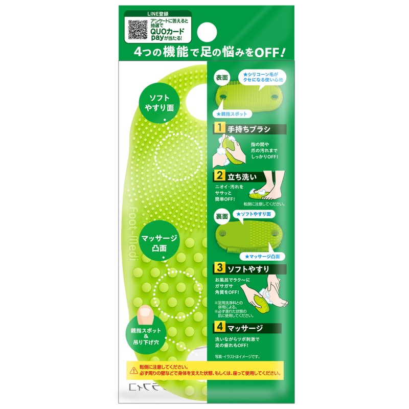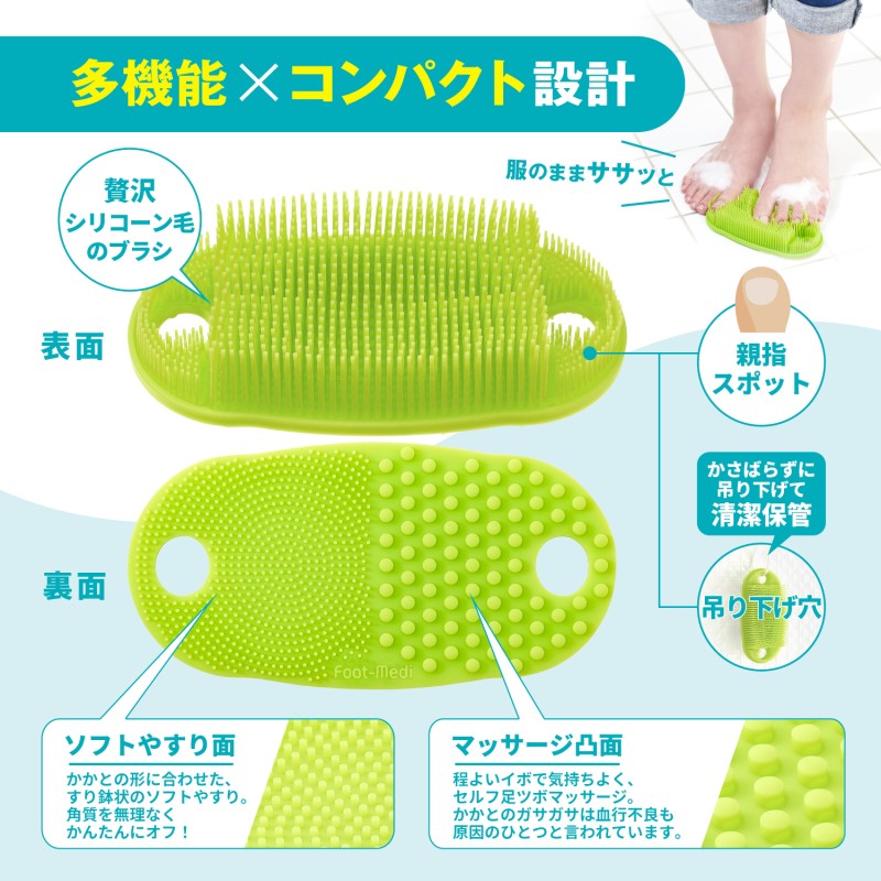 ●これ一つで、手持ちブラシ・立ち洗いマット・ソフトやすり・マッサージにと、4つの機能を集約。