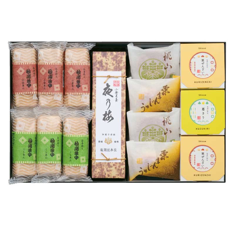 最中(つぶ餡・こし餡)×各3、中羊羹×1栗まんじゅう×2、桃山×2、
