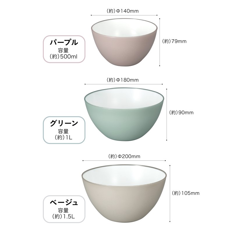 調理後は食器として食卓へ並べられる万能ボウル。電子レンジ、食洗機対応。様々な用途に合わせて選べる4サイズ各3色展開。