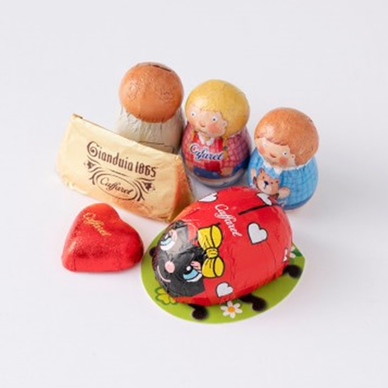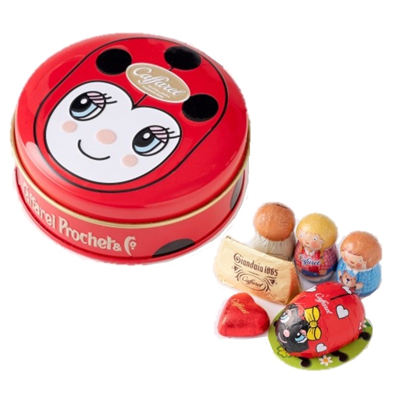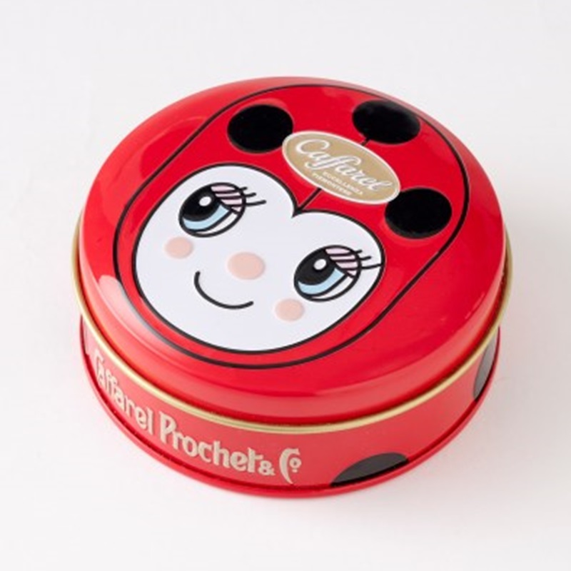 てんとう虫のビッグフェイスがキュートな缶に人気のてんとう虫・きのこのパッケージチョコをアソート。