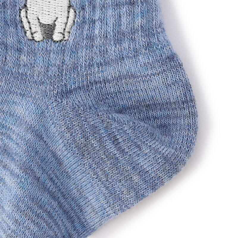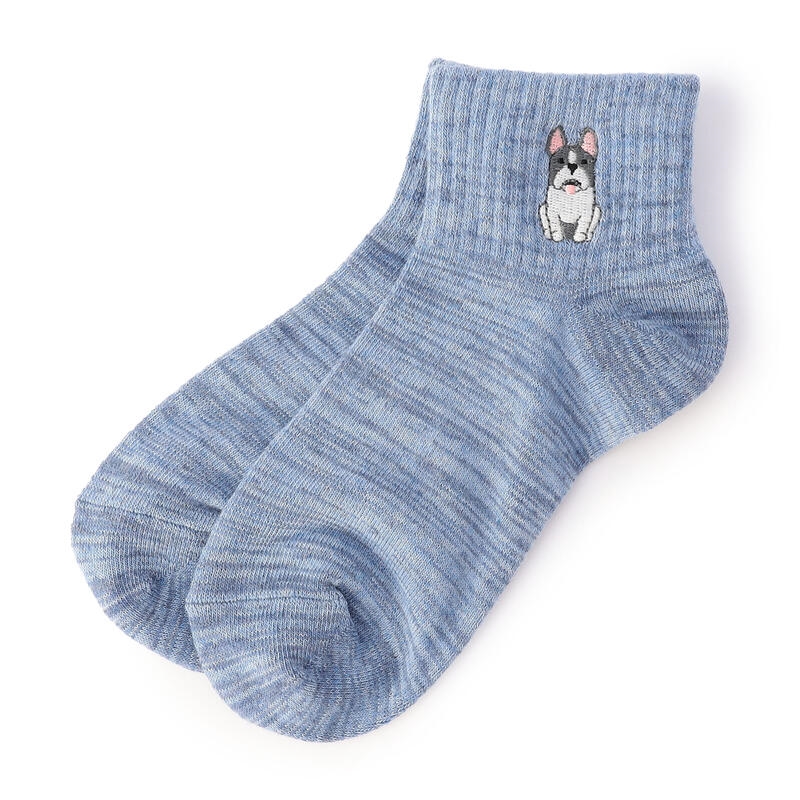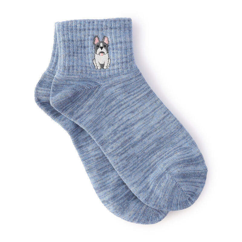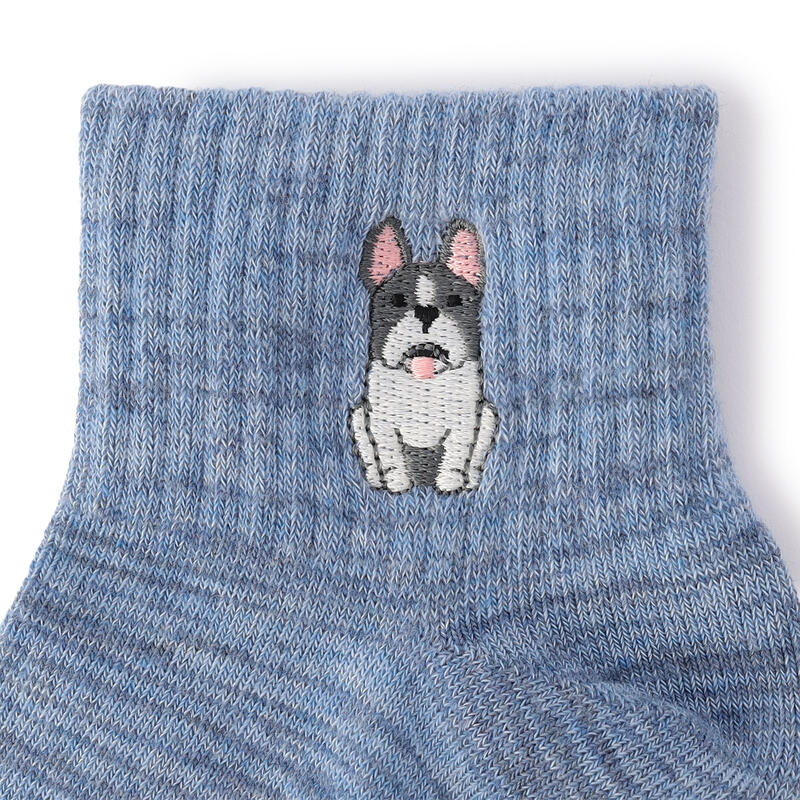 フットイン部分をリブ仕立てにし、お行儀のよい犬モチーフのステッチを配したソックス。