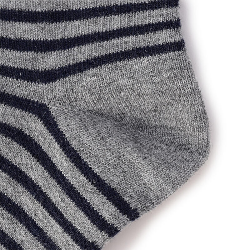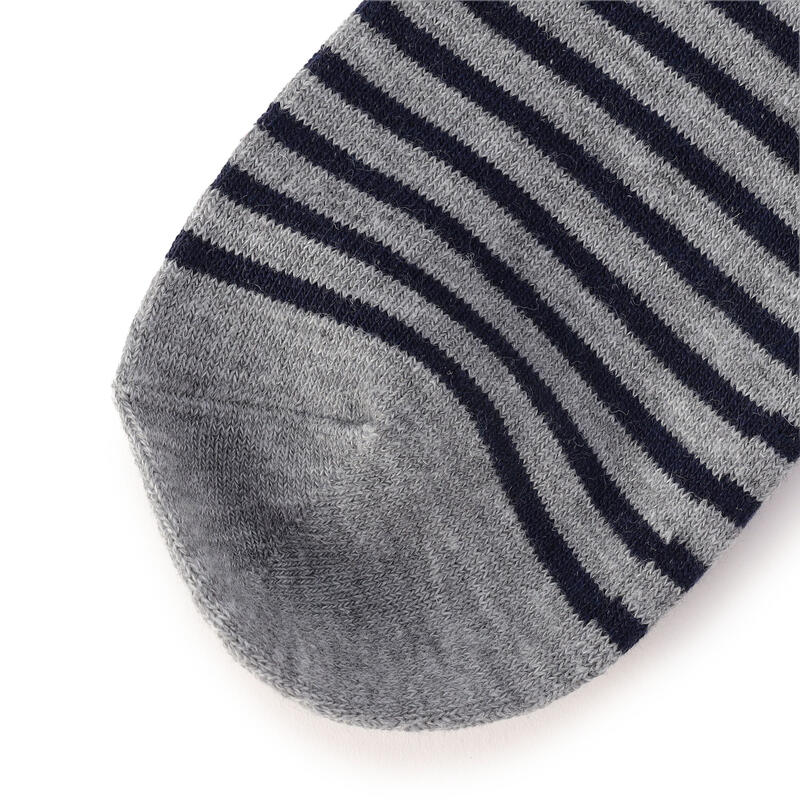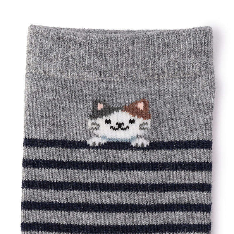 ボーダー柄にネコモチーフを組み合わせた、愛くるしい表情のクルー丈ソックス。
