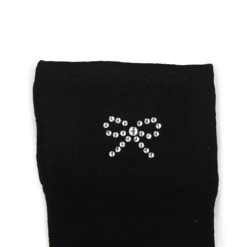 ラインストーンでリボンを入れているカワイイデザインのハイソックスです。