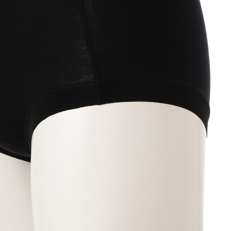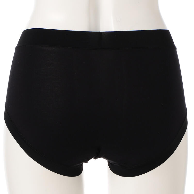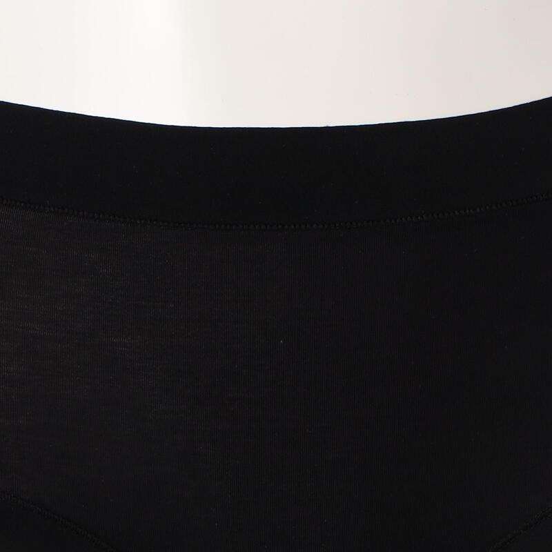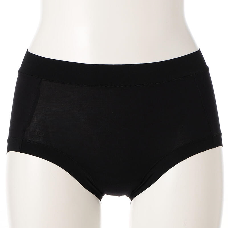ウエストと足口はゴム不使用の幅広テープ仕様で締め付けにくく、フィット感が良く着ていることを