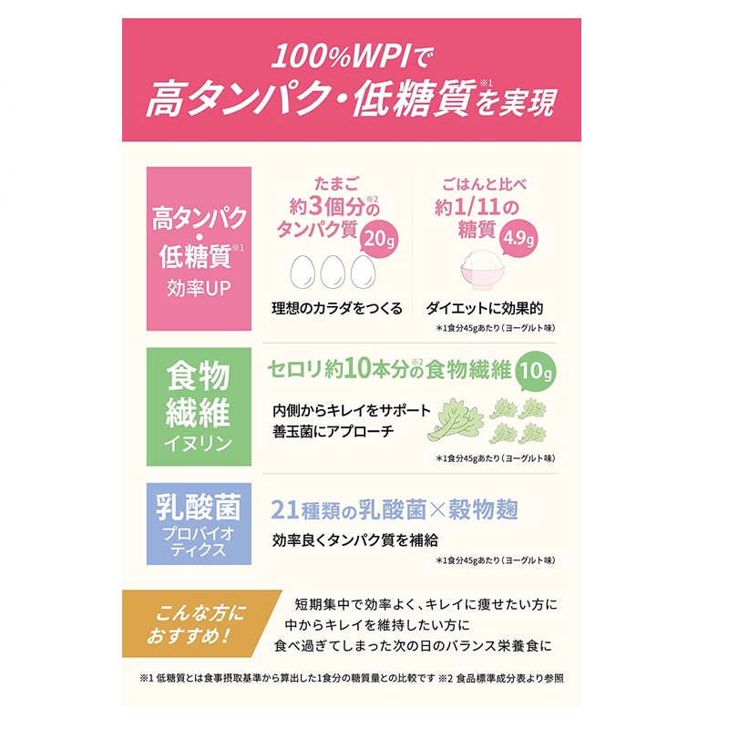 100%WPI(ホエイプロテインアイソレート)のプロテインダイエットで、賢く、効率よく、健康的に理想の身体へ。