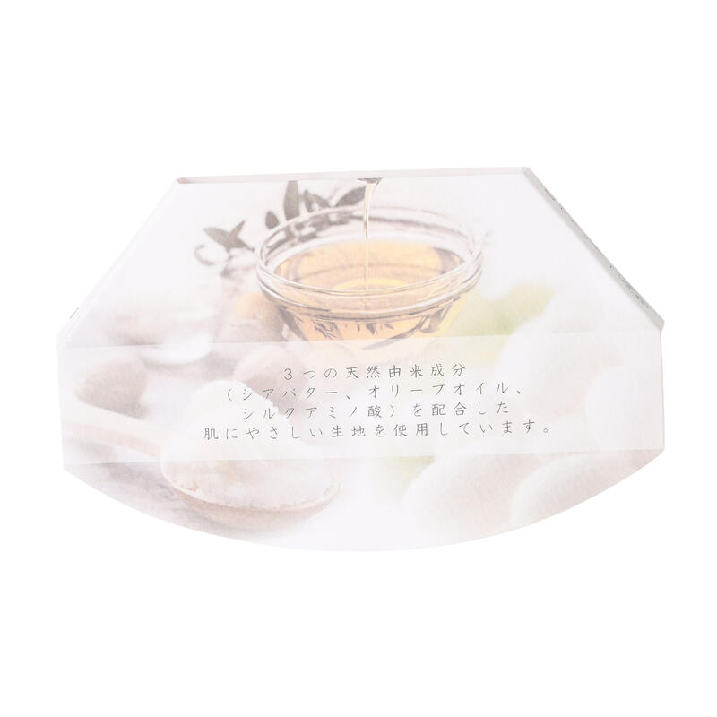 3種の天然由来成分(シアバター/オリーブオイル/シルクアミノ酸)を配合し肌にやさしい生地を使用。