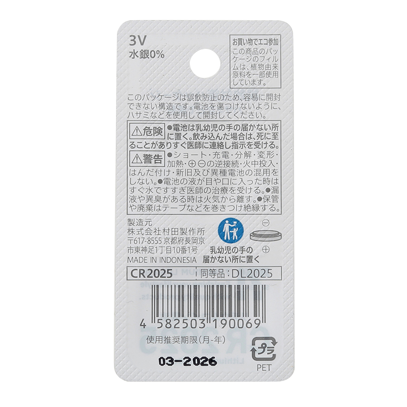 - 負極:リチウム 正極:二酸化マンガン ※環境負荷物質の水銀、鉛、カドニウムなどの重金属は含まれない。