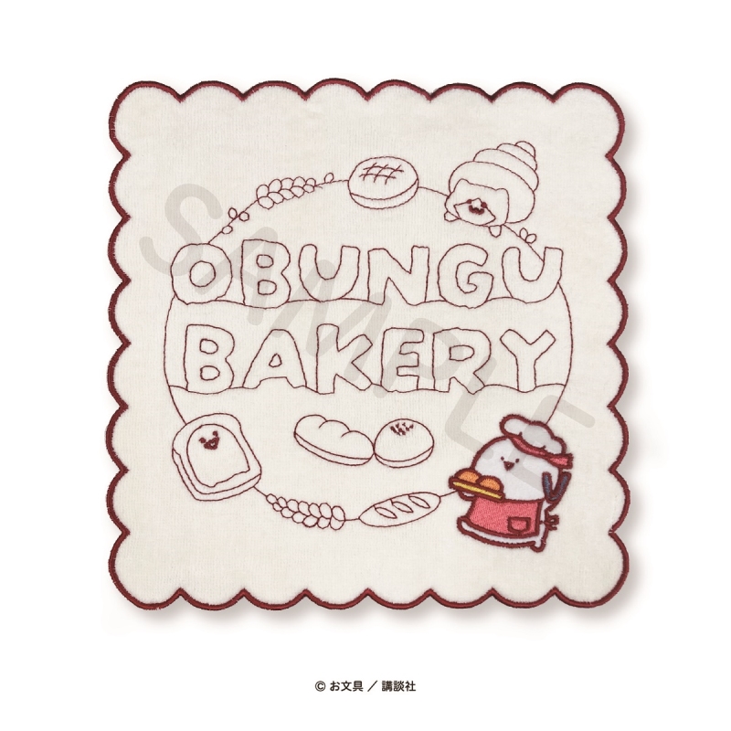 ふちがかわいいお文具さんのタオルハンカチです。ベーカリーお文具さんの刺繍が一層かわいさを引き立ててくれています