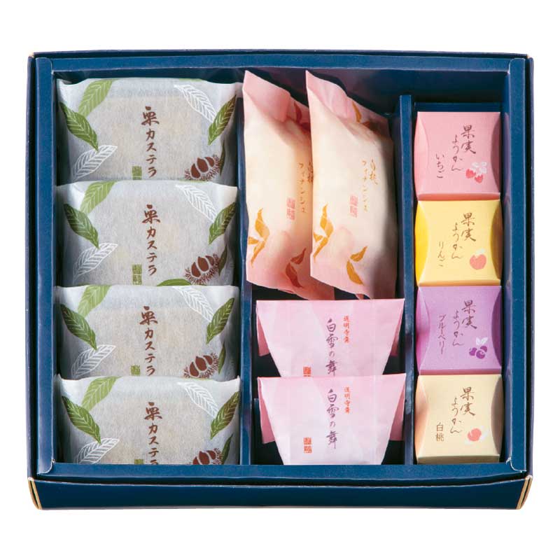 栗カステラ×4、白桃フィナンシェ×2、白雪の舞×2、果実ようかん(白桃、りんご、いちご、ブルーベリー)×各1