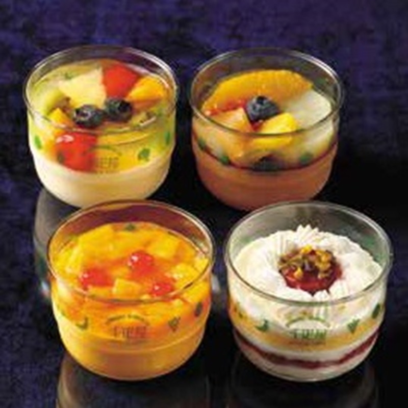チョコレートムース、フルーツババロア、マンゴームース、ショートケーキのアソートケーキ。