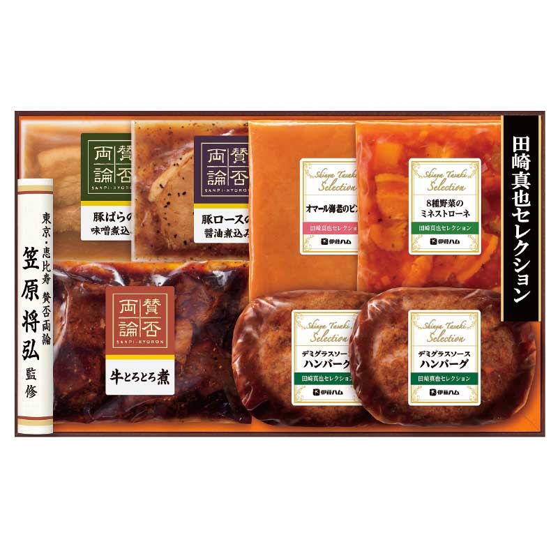 牛とろとろ煮150g、豚ロースの醤油煮込み70g、デミグラスソースハンバーグ120g×2、他3種3点