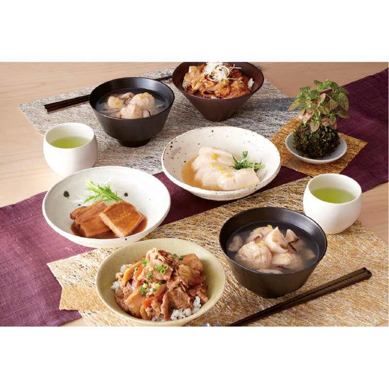 豚ばらの味噌煮込み70g蒸し鶏の柚子出汁餡:冷蔵庫で解凍後スライス。その他:4分~14分湯煎。