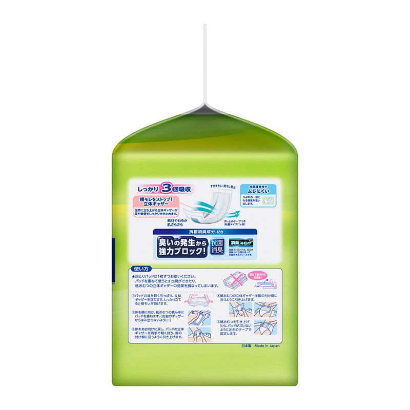 テープ式、テープ式にもなるパンツと一緒に使う、モレ防止と肌へのやさしさを考えた尿とりパッドです。
