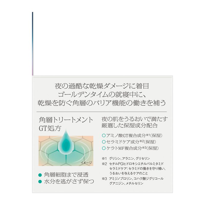 夜の過酷な乾燥ダメージに着目。ゴールデンタイムの就寝中に、乾燥を防ぐ角層のバリア機能の働きを補う。