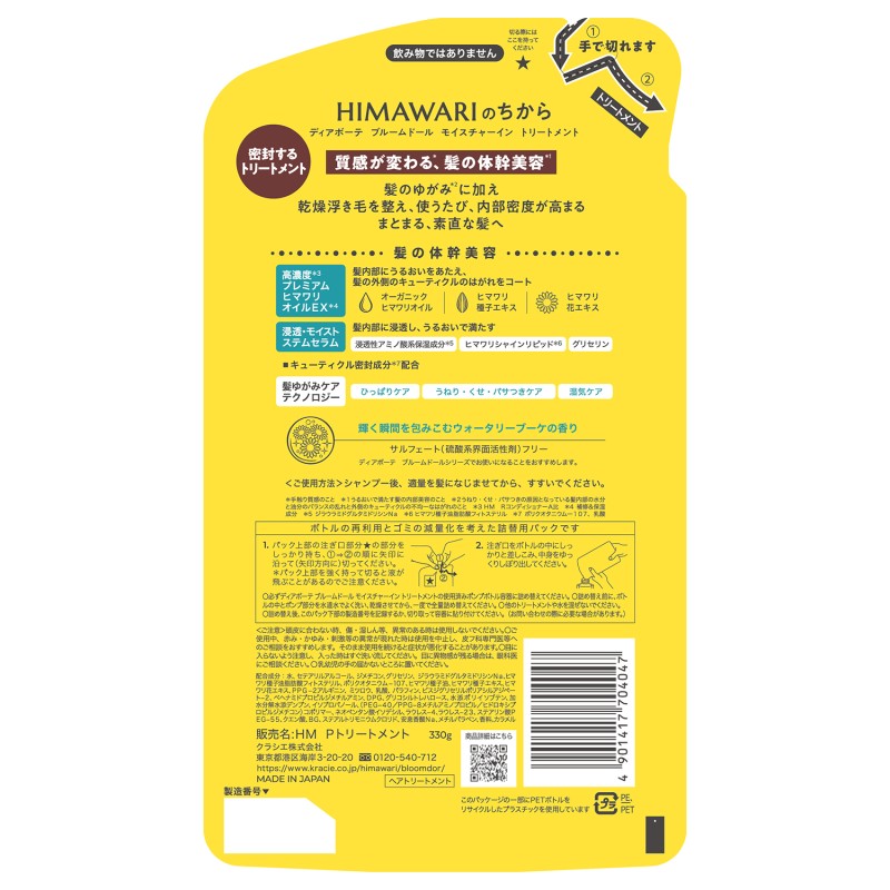 ●浸透・モイストステムセラム配合。髪内部に浸透し、うるおいで満たす。
