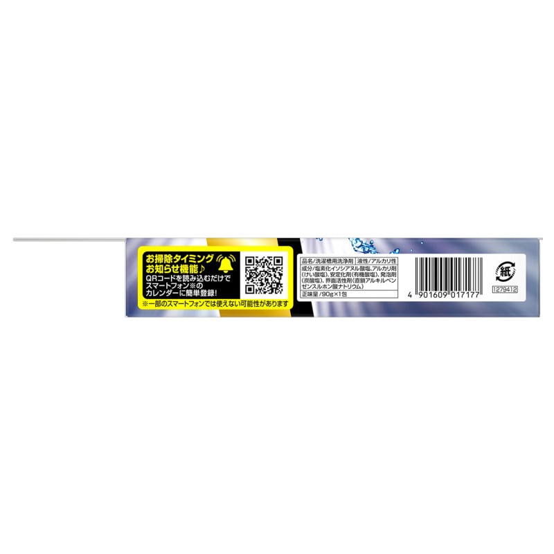 - 塩素化イソシアヌル酸塩、アルカリ剤(けい酸塩)、安定化剤(有機酸塩)、発泡剤(炭酸塩)、界面活性剤(直鎖アルキルベンザン