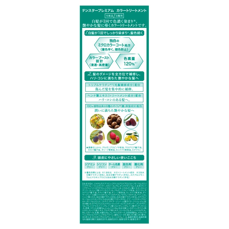 実油、ダイマージリノール酸(フィトステリル/イソステアリル/セチル/ステアリル/ベヘニル)、ヘンナ葉エキス、加水分解ケラ