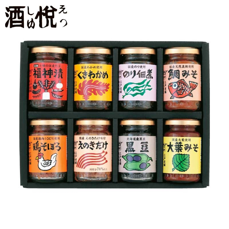 福神漬90g、くきわかめ75g、のり佃煮95g、鯛みそ100g、鶏そぼろ50g、えのきだけ90g、