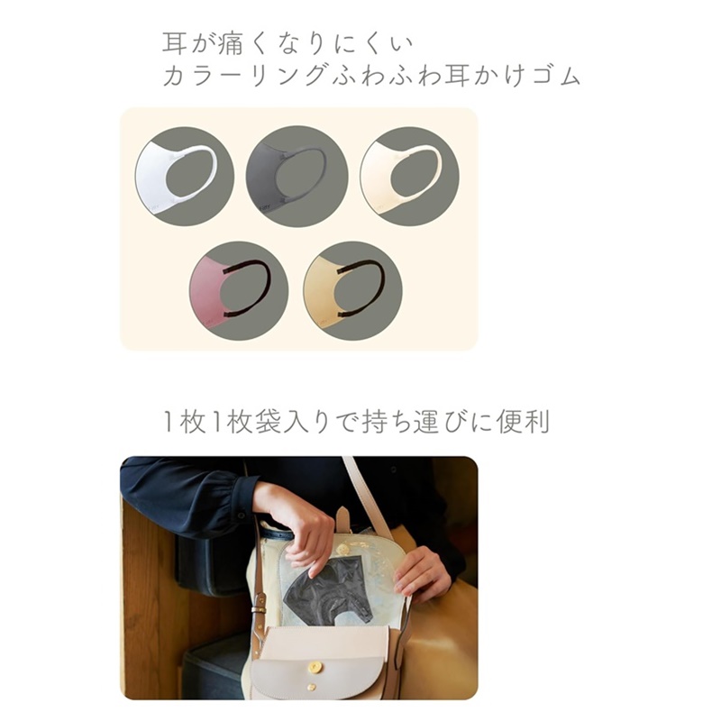 耳にやさしい幅広ふわふわ耳ゴムで耳が痛くなりにくく、口元があたらず呼吸・会話がしやすい立体形状のマスクです。