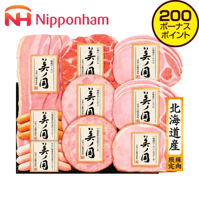 熟成ロースハム45g×2、熟成ロースハムステーキ50g、熟成ベーコン48g、肩ロース生ハム30g