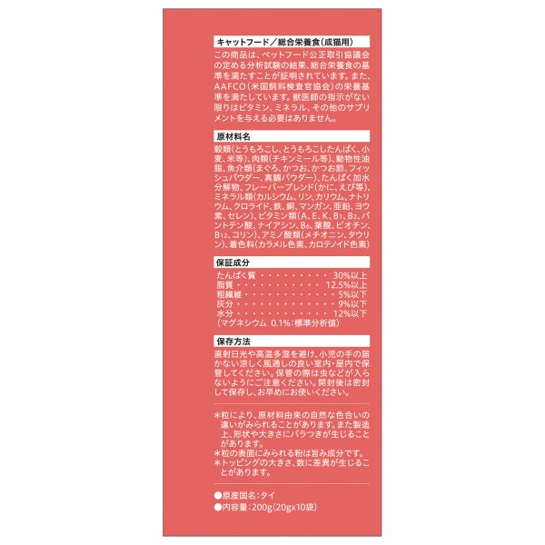 真鯛風味のかつお節チップ、そしてカリッとした食感がネコちゃんの食欲をそそる総合栄養食。合成着色料無添加。