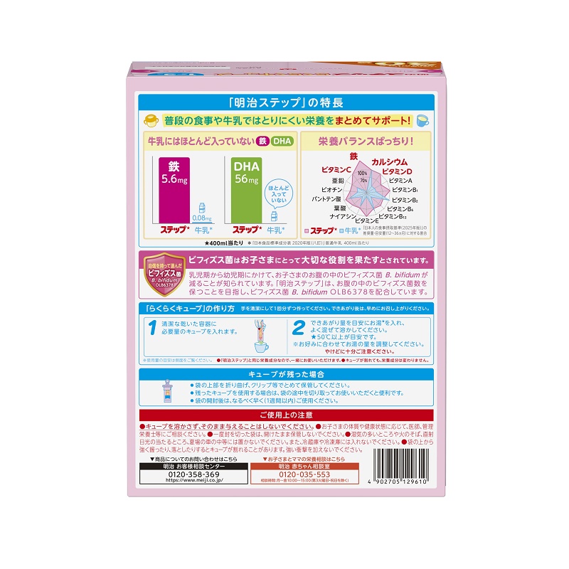 鉄の吸収を助けるビタミンC、カルシウムの吸収を助けるビタミンDを、明治ステップはコップ2杯(400ml)で1日に必要な量