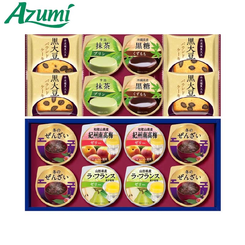 冬のぜんざい50g×4、黒大豆のパウンドケーキ4個、宇治抹茶プリン57g×2、