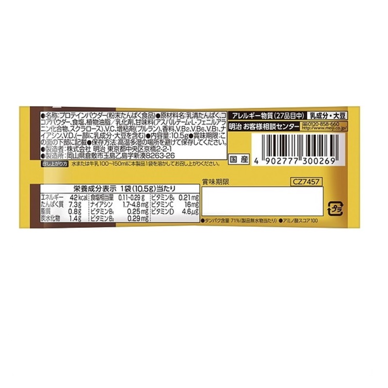 - 乳清たんぱく、ココアパウダー、植物油脂、食塩、デキストリン/乳化剤、V.C、