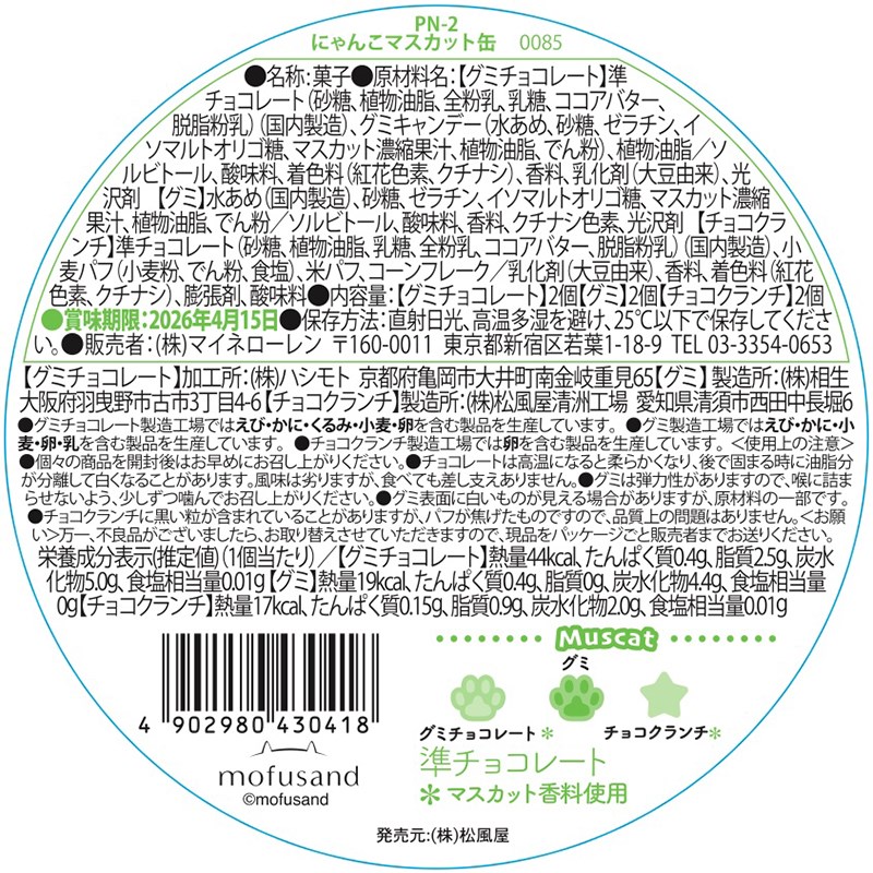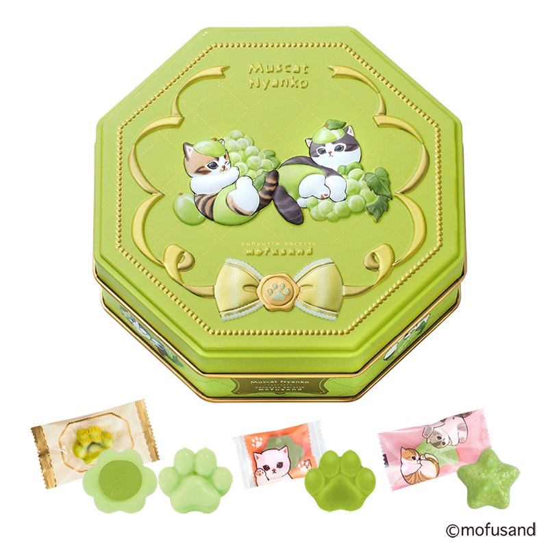 ぷっくりとかわいいエンボス仕様の缶に、マスカット風味の肉球型グミチョコレート、クランチ、肉球型グミをアソートしました
